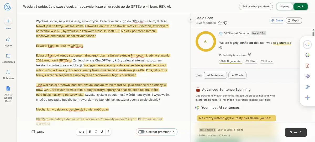 W 2025 GPTZero dostało turbodoładowanie: pięć nowych modeli od czerwca, w tym wielojęzyczny i anty-bypassowy. Dodano wyszukiwanie źródeł i odtwarzanie edycji pisania. Tian podkreśla edukacyjny aspekt – narzędzie nie tylko wykrywa, ale pomaga poprawiać styl, by brzmiał bardziej ludzko.